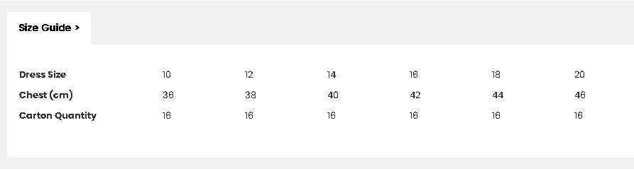 | Bust (ins) | 36 | 36 | 38 | 40 | 43 | 45 |