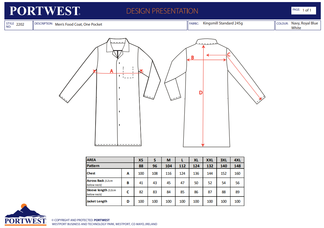 Portwest 2202 Men’s Food Coat, One Pocket 2202