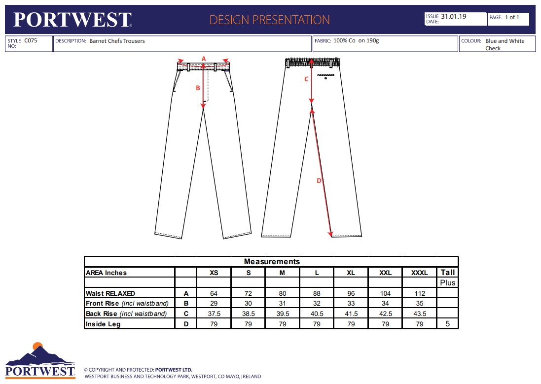 Portwest C075 Barnet Chefs Trousers C075