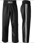 Suitable for all styles of Martial Arts. Incredibly comfortable during intense training sessions. Reinforced stitching and seams for durability. Black trousers with a contracting stripe of colour. Elasticated waist with additional tie for perfect fit. Polycotton.